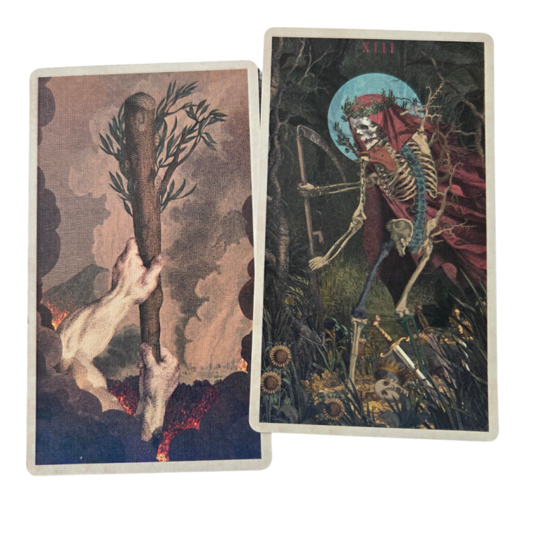 Pagen visar att något inom oss behöver förändras. Den mörka bakgrunden symboliserar att insikt sällan är smärtfri. Det här kortet markerar en vändpunkt: