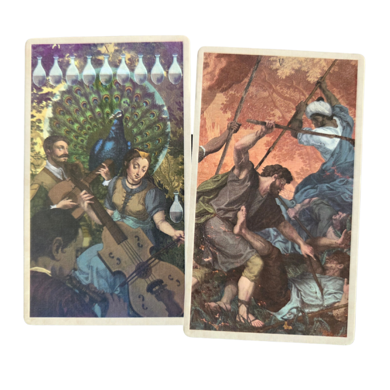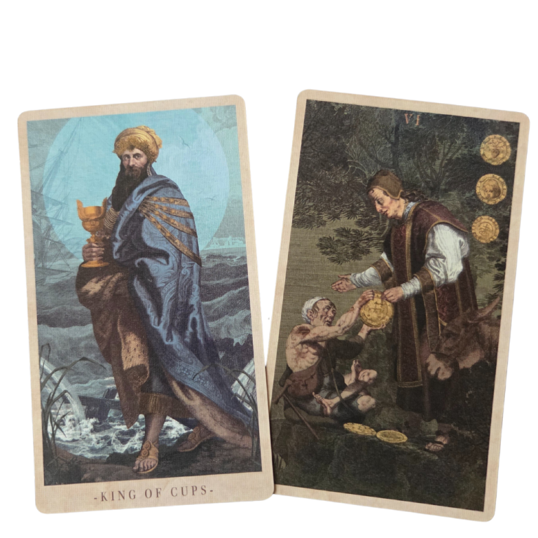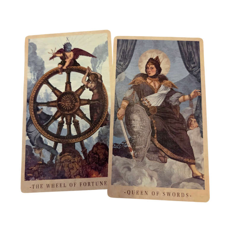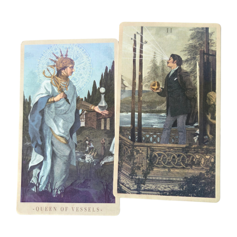 Drottningen representerar vattnets djup och jordens stabilitet. Hon påminner oss om att våra känslor är mer än reaktioner – de är en form av näring. De påverkar våra liv på alla plan, även kroppsligt, och hon uppmanar oss att stanna upp och känna efter: