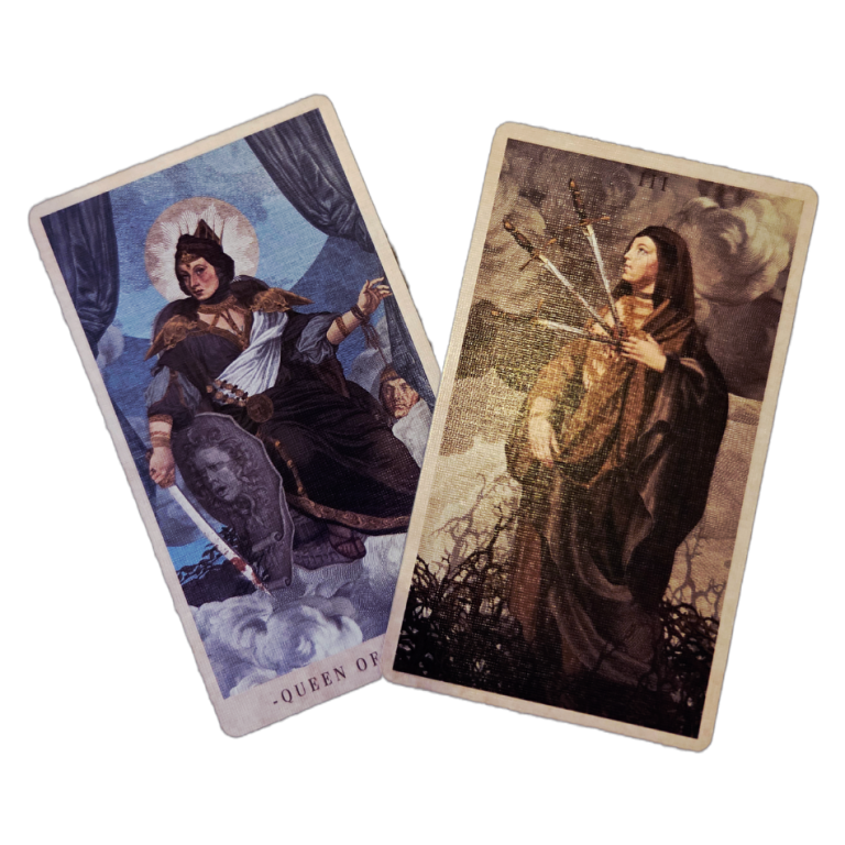 Den här veckan känns som en direkt fortsättning på förra veckan. Veckan handlar om att möta obekväma sanningar ( framförallt om förra veckans fullmåne fick gamla sår att bubbla upp till ytan). Kombinationen visar på en smärtsam insikt (Tre i Svärd) som kräver klarhet, mognad och integritet (Drottningen i Svärd). Det handlar om att våga se verkligheten som den är, även när den gör ont.