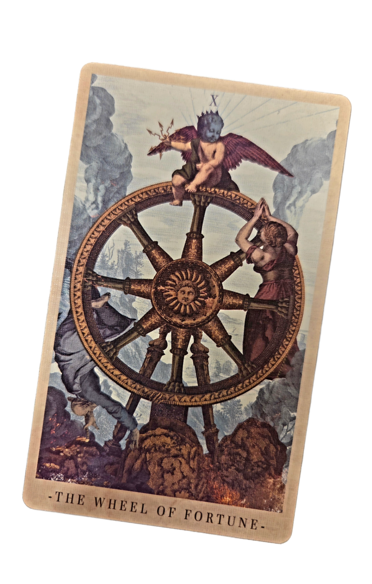 Wheel of fortune är ett kort som symboliserar livets rörelse, berg och dalar. I Terra Volatile leken så är wheel of fortune en bild av ”Dharmahjulet”, cirkeln runt representerar helhet, visdom och sammanhang, att allt hänger ihop, navet representerar disciplin och focus och de åtta ekrarna representerar den ”8 faldiga vägen”. Det är en symbol för livets kretslopp.
